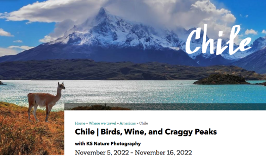 Embark on a journey with photography expert Krisztina Scheeff to capture compelling images of birds and other wildlife amid the dramatic landscapes of Chile’s central and Patagonian regions. Your adventure begins in the cosmopolitan capital of Santiago; search for a variety of endemic avifauna in nearby natural areas, including marsh, reservoir, and dry forest habitats, and sample a few of the country’s acclaimed wineries. Encounter pelagic species and waterfowl on the coast before making your way to the breathtaking vistas of Torres del Paine National Park, where rolling plains, waterfalls, lakes, and glaciers are framed by sky-scraping Andean peaks.